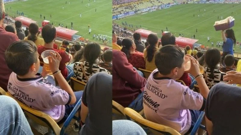 Las imágenes se tomaron en el estadio Morelos, sede del Atlético de Morelia, y en ellas se ve al menor sosteniendo un vaso de cerveza y...