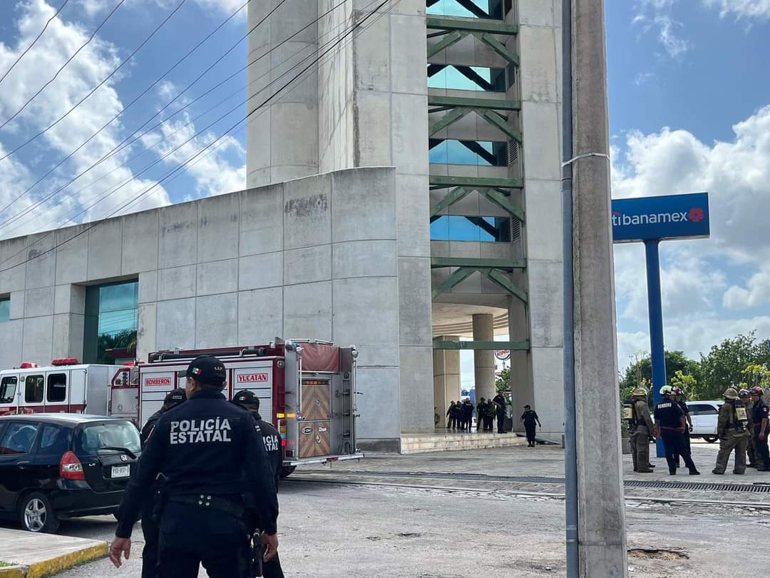 Fuerte movilización de los cuerpos de seguridad y bomberos de la SSP, se registró esta mañana en la Torre Banamex, ubicada en el norte de Mérida.